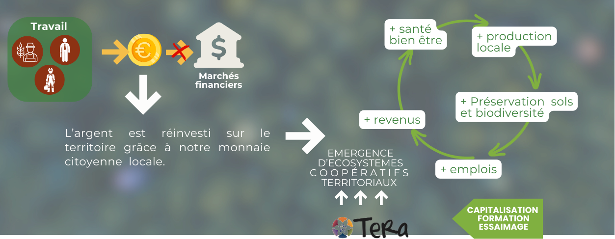 Nous créons un écosystème transversal qui produit, distribue et valorise en monnaie citoyenne locale ce qui est vital aux habitants, aux entreprises locales et aux collectivités territoriales :
